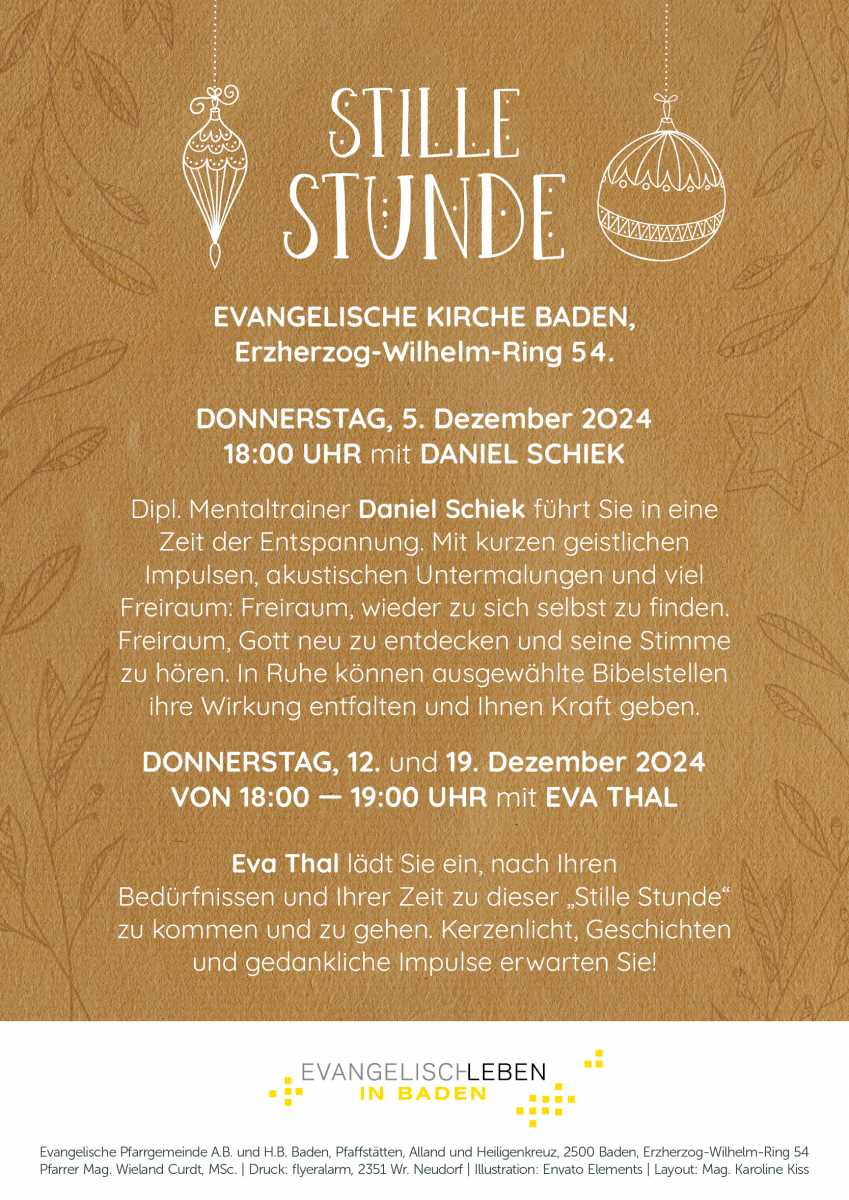 Dipl.-Mentaltrainer Daniel Schiek führt Sie am 5. Dezember in eine Zeit der Entspannung. Mit kurzen geistlichen Impulsen, akustischen Untermalungen und viel Freiraum: Freiraum, wieder zu sich selbst zu finden. Freiraum, Gott neu zu entdecken und seine Stimme zu hören. In Ruhe können ausgewählte Bibelstellen ihre Wirkung entfalten und Ihnen Kraft geben.