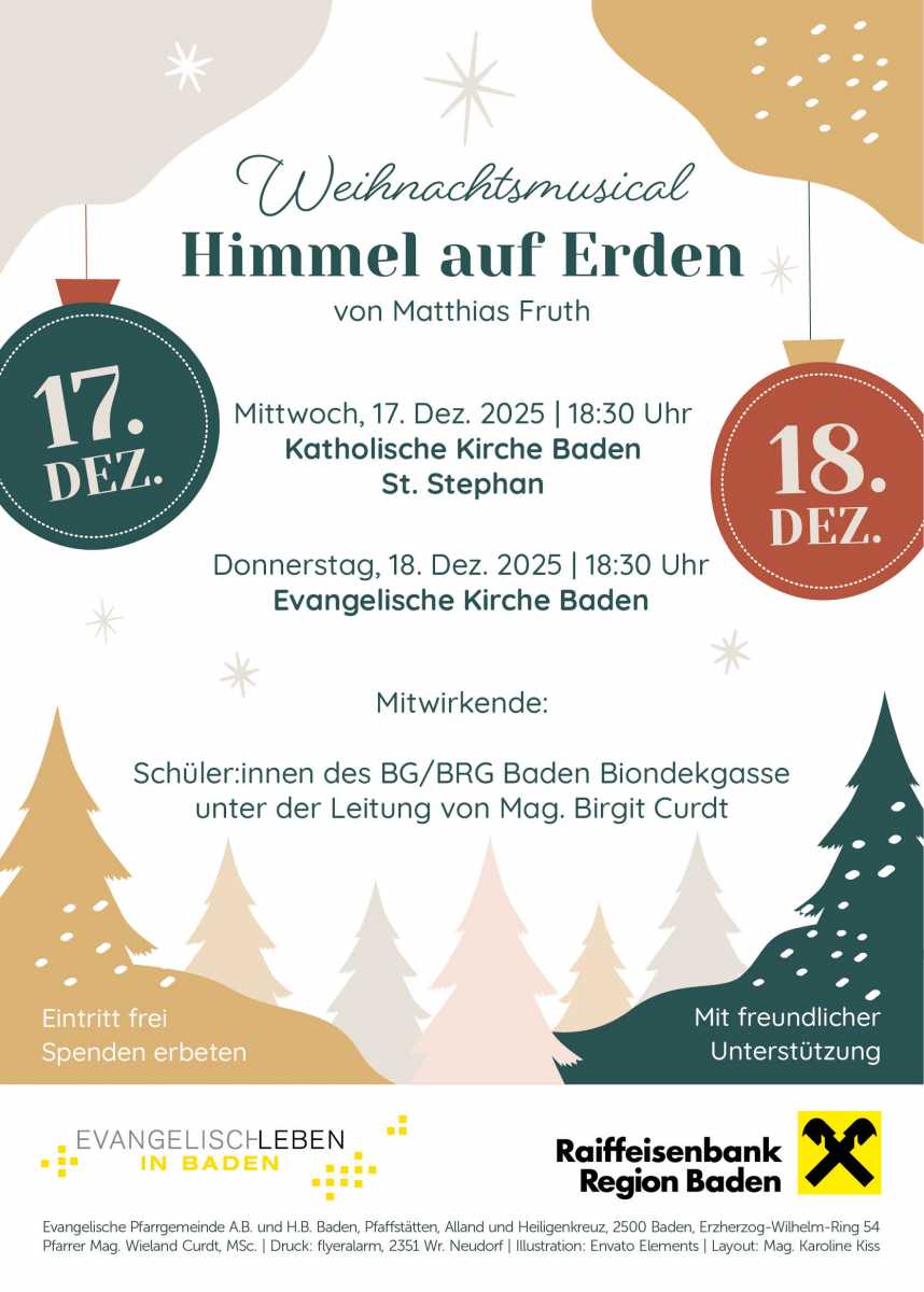 aufgeführt. Begleitet von einem Musik-Ensemble singen und spielen Jugendliche des BG/BRG Biondekgasse Baden die Weihnachtsgeschichte. Josef, für den alles schief zu laufen scheint (seine Frau erwartet ein Kind, das nicht von ihm ist), erlebt plötzlich den „Himmel auf Erden“.
