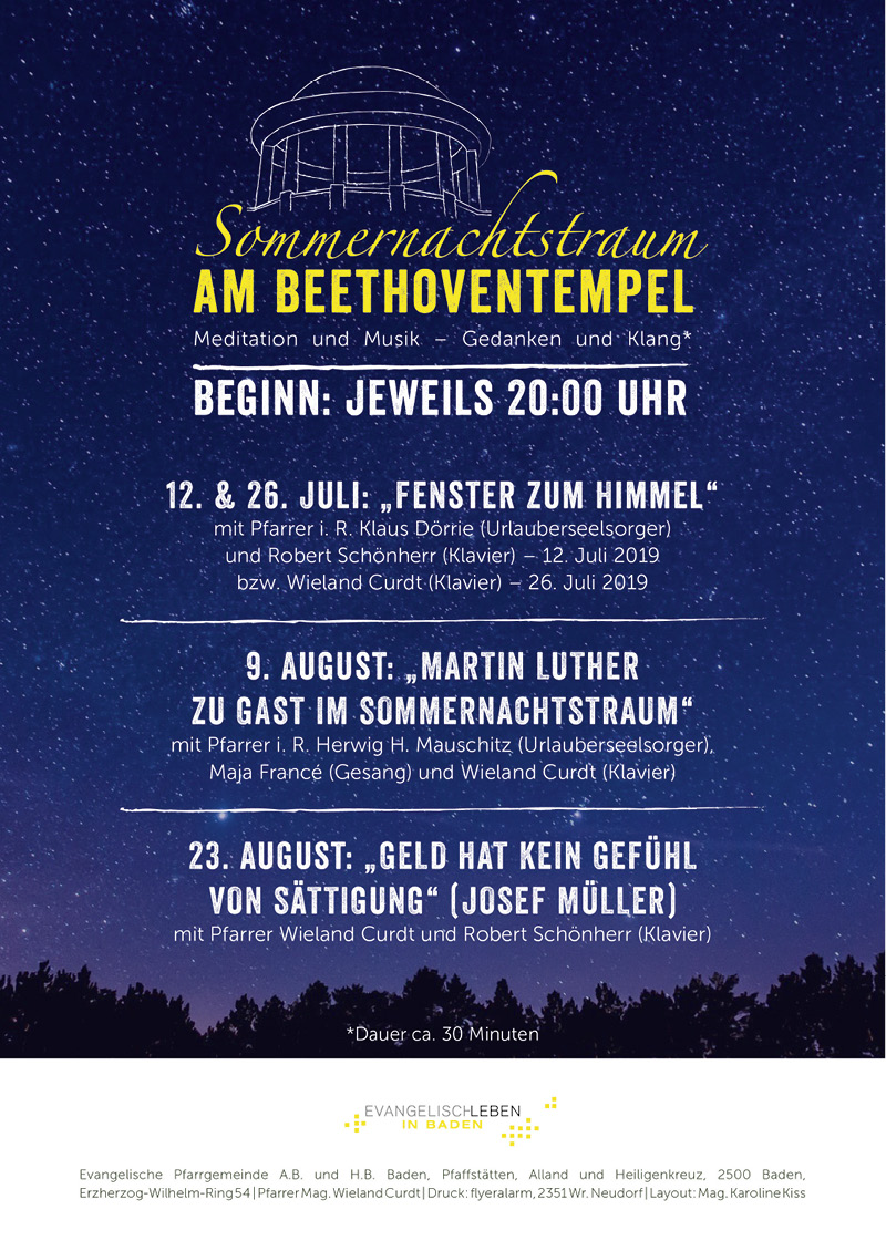 Im Juli und August finden 14tägig Veranstaltungen am Beethoventempel statt. Gedanken, Musik und Texte regen zum Nachdenken und Träumen an. Sie können auf der Wiese liegen, auf der Bank sitzen, gespannt zuhören oder einfach vor sich hindämmern. Die Urlauberseelsorger und Pfarrer Wieland Curdt laden Sie herzlichst dazu ein: