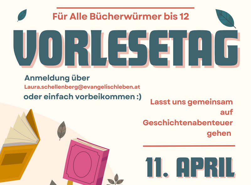 Für alle Bücherwürmer bis 12 Jahre! Habt ihr Lust auf eine gemütliche Vorlesestunde? Anlässlich des Österreichischen Vorlesetages (26. März) organisiert die Evangelische Gemeinde Baden am Samstag, den 11. April von 10 bis 12:00 Uhr im Gemeindesaal ein Vorleseangebot!