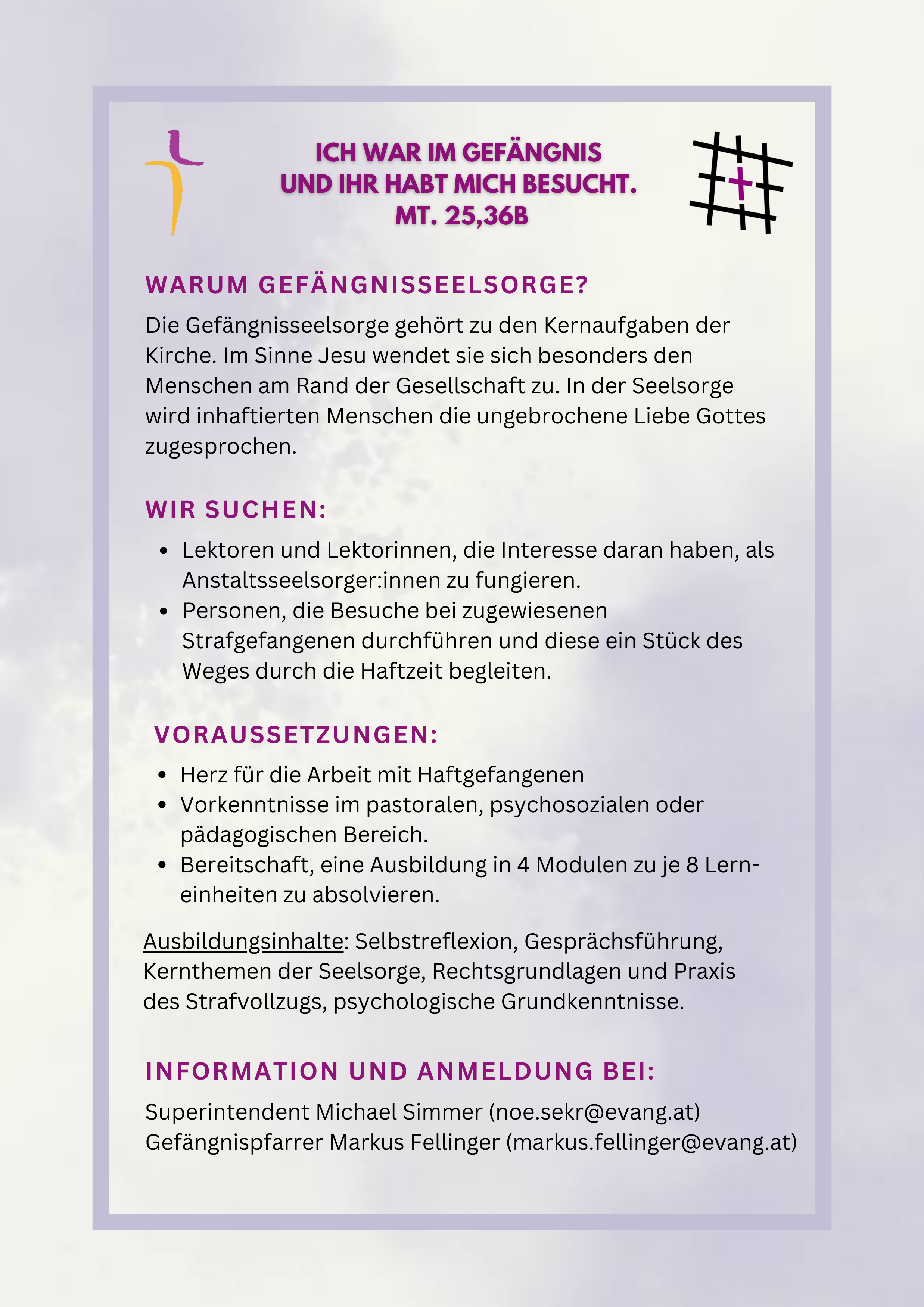 - Lektoren und Lektorinnen, die Interesse daran haben, als Anstaltsseelsorger:innen zu fungieren.