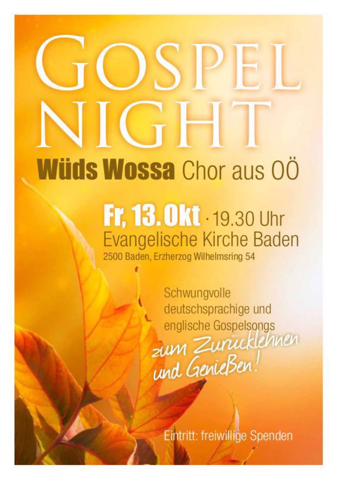 Der "Wüds Wossa Chor" aus Oberösterreich begrüßt Sie zu einem schwungvollen Gospel-Abend mit deutschsprachigen und englischen Gospelsongs zum Zurücklehnen und Genießen! Wir freuen uns auf Ihr Kommen!