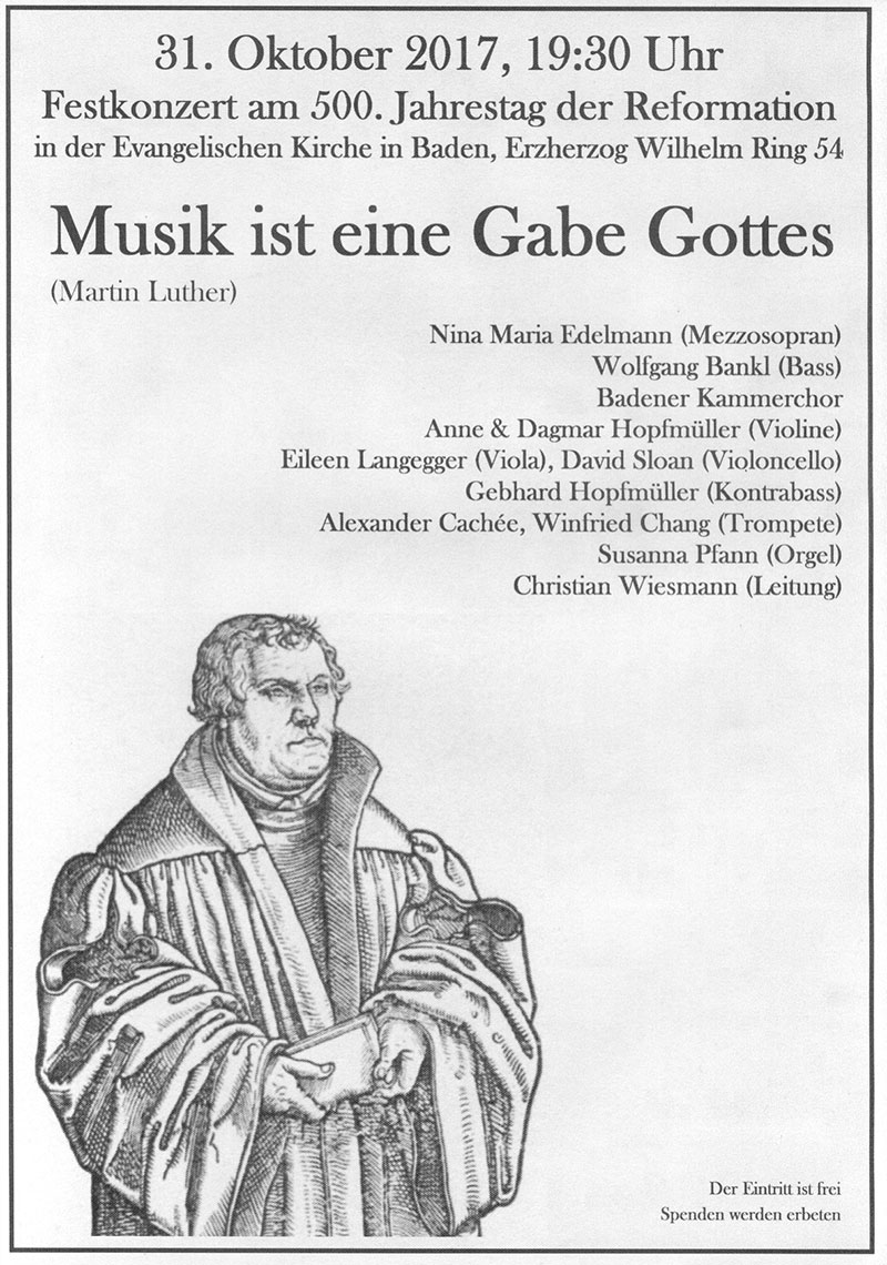 Musik spielte im Leben Martin Lutherseine große Rolle. Schon als Kind sang er im Chor, studierte neben Theologie auch Gesang und Kontrapunkt und spielte Laute. Ihm war die Wirkung von Musik auf die Psyche des einzelnen Menschen und auf die Gemeinschaftbewusst, er setzte sie im Gegensatz zu anderen Reformatoren auch gezielt ein und beeinflusste dadurch stark die Entwicklung der Musik bis in unsere Zeit. Am 500. Jahrestag der Reformation wird in unserer Kirche Musik aus den Anfängen der Reformation und von evangelisch geprägten Komponisten erklingen. Nina Maria Edelmann, Wolfgang Bankl und der Badener Kammerchor werden gemeinsam mit Susanna Pfann an der Orgel und einem Instrumentalensemble Werke der bekannten barocken Großmeister (H.Schütz, S. Scheidt, D. Buxtehude, G.Ph. Telemann, J. S. Bach) sowie Musik aus dem 19. und 20. Jahrhundert (F. Mendelssohn-Bartholdy, J. Brahms, H. Distler) interpretieren. Auch weniger bekannte Werke wie Stücke des aus Pottendorf stammenden Kantors Andreas Rauch aus dem frühen 17. Jahrhundert stehen auf dem Programm dieses Festkonzerts im Geiste Martin Luthers, der meinte: