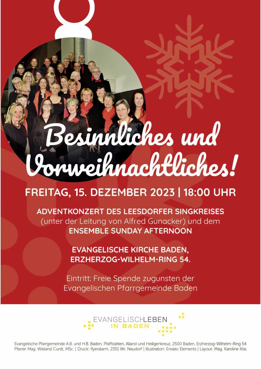 findet ein Advent-Benefizkonzert des Leesdorfer Singkreises (unter der Leitung von Alfred Gunacker) und dem Ensemble Sunday Afternoon in der Evangelischen Kirche Baden, Erzherzog Wilhelm-Ring 54 statt.