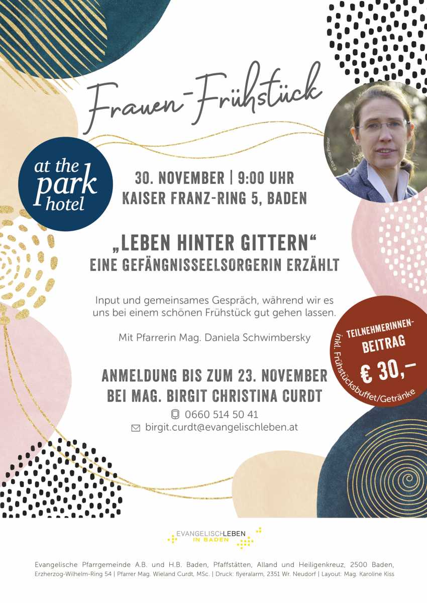 Gefängnisseelsorgerin Mag. Daniela Schwimbersky gibt bei einem entspannten Vital-Frühstück im Hotel At the Park in Baden Einblicke in die Gefängnisseelsorge zum Thema „Leben hinter Gittern“.